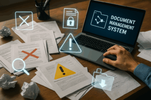 În acest articol vom analiza cele mai frecvente șapte greșeli întâlnite în companiile care nu utilizează un sistem profesional de management al documentelor (DMS). Vom evidenția consecințele reale ale acestor erori și vom oferi soluții clare, inspirate din modul în care un DMS inteligent poate preveni sau corecta aceste probleme.